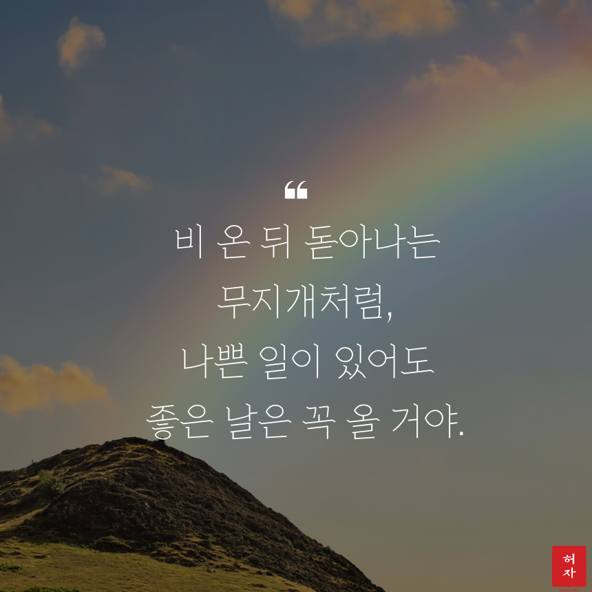 9. 비 온 뒤 돋아나는 무지개처럼, 나쁜 일이 있어도 좋은 날은 꼭 올 거야. 우리 인생도 좋지 않은 일이 있어도 결국 좋은 날이 오지 않을까? 문제는 시기의 문제이다. 그때까지 참고 버티는 것이 중요할 뿐.