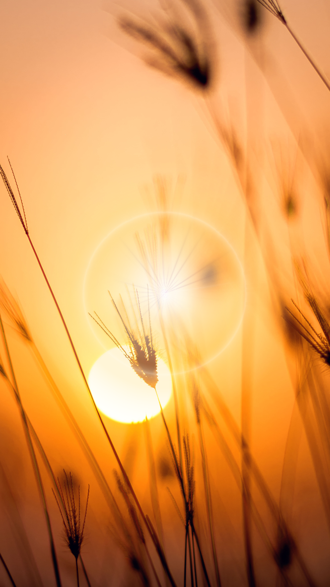 풀과 저무는 태양의 빛이 잘 어우러진 저녁 배경 화면 사진.