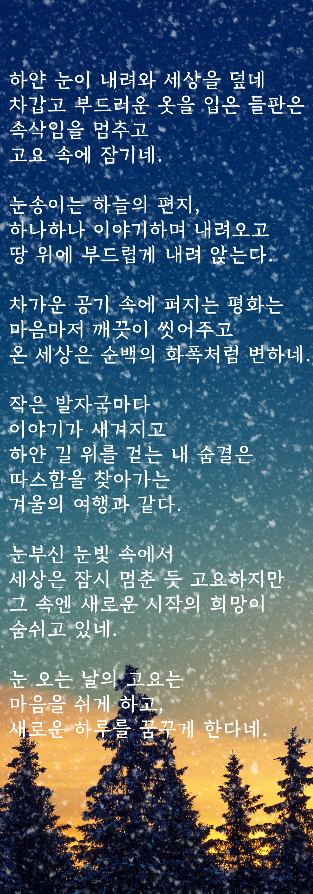 차가운 공기 속에 퍼지는 평화는 마음마저 깨끗이 씻어주고 온 세상은 순백의 화폭처럼 변하네. 작은 발자국마다 이야기가 새겨지고 하얀 길 위를 걷는 내 숨결은 따스함을 찾아가는 겨울의 여행과 같다.