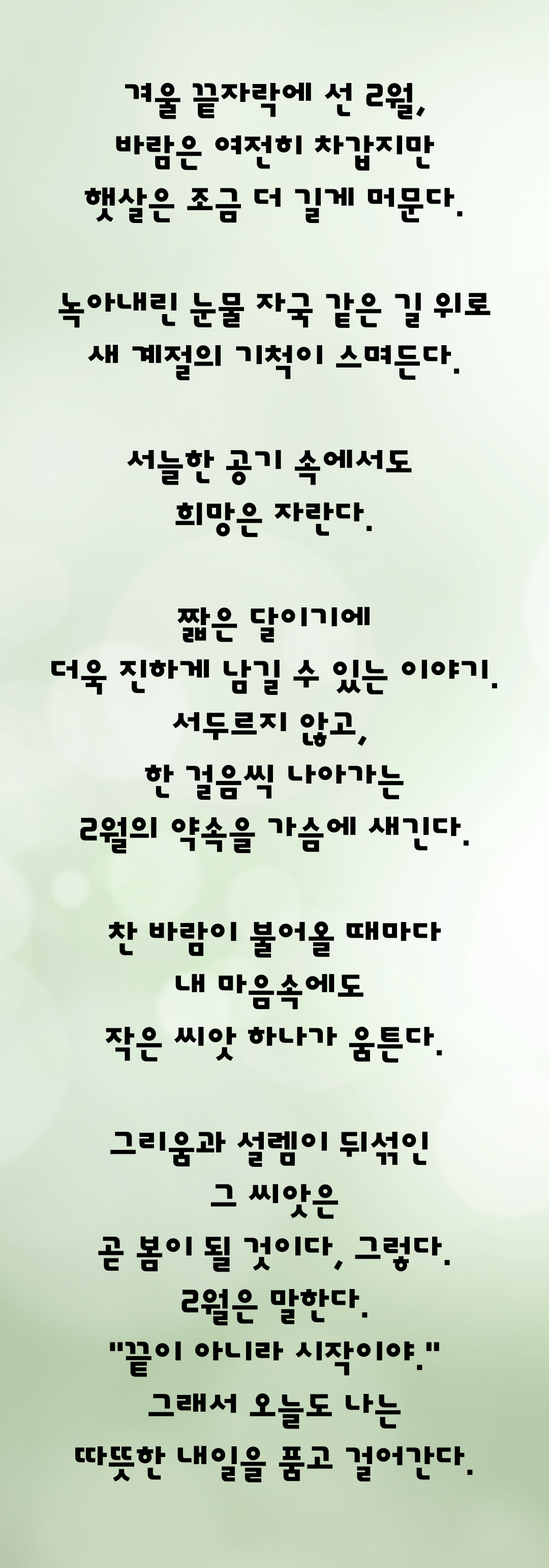 겨울 끝자락에 선 2월, 바람은 여전히 차갑지만 햇살은 조금 더 길게 머문다. 녹아내린 눈물 자국 같은 길 위로 새 계절의 기척이 스며든다. 서늘한 공기 속에서도 희망은 자란다. 짧은 달이기에 더욱 진하게 남길 수 있는 이야기. 서두르지 않고, 한 걸음씩 나아가는 2월의 약속을 가슴에 새긴다. 찬 바람이 불어올 때마다 내 마음속에도 작은 씨앗 하나가 움튼다. 그리움과 설렘이 뒤섞인 그 씨앗은 곧 봄이 될 것이다, 그렇다. 2월은 말한다. "끝이 아니라 시작이야." 그래서 오늘도 나는 따뜻한 내일을 품고 걸어간다.