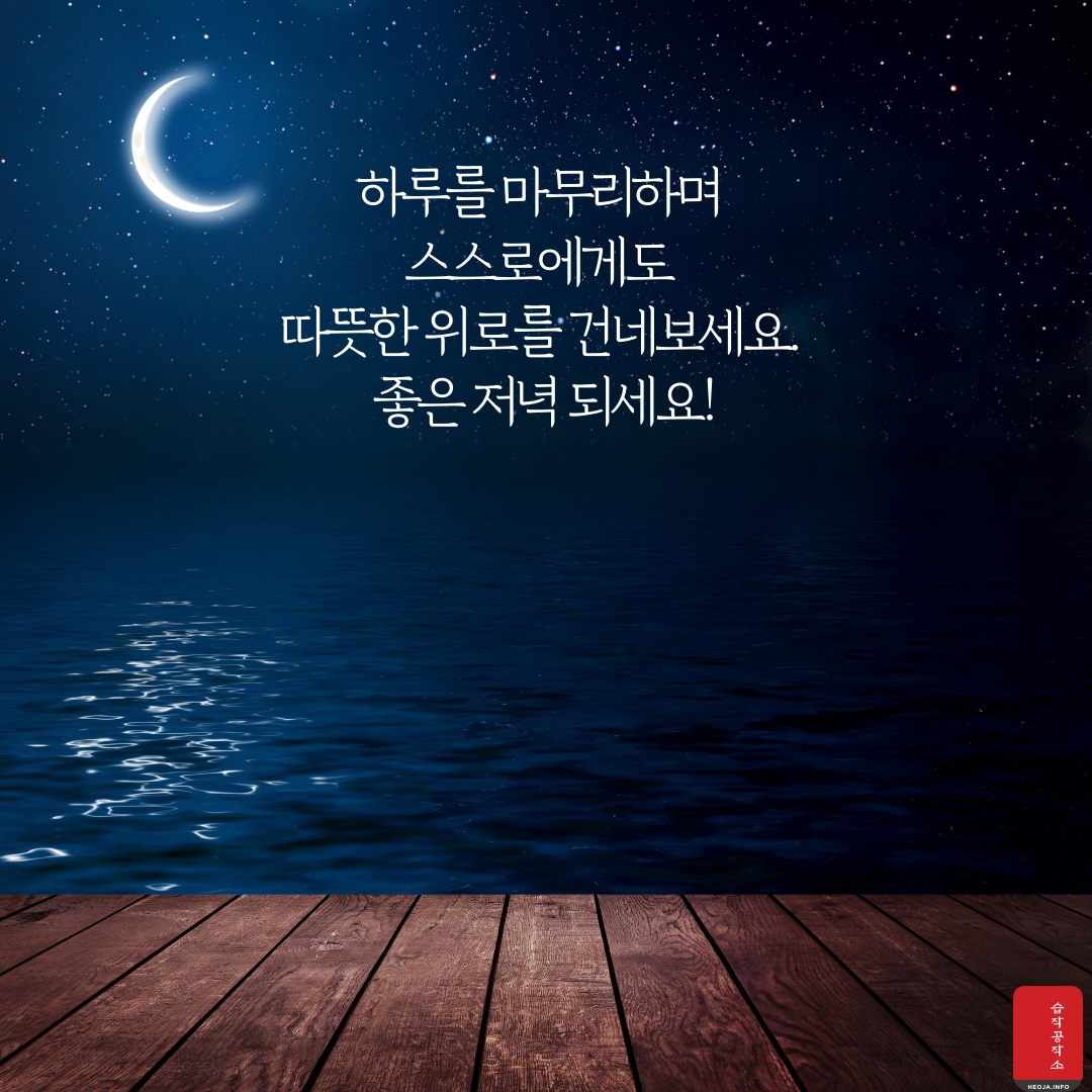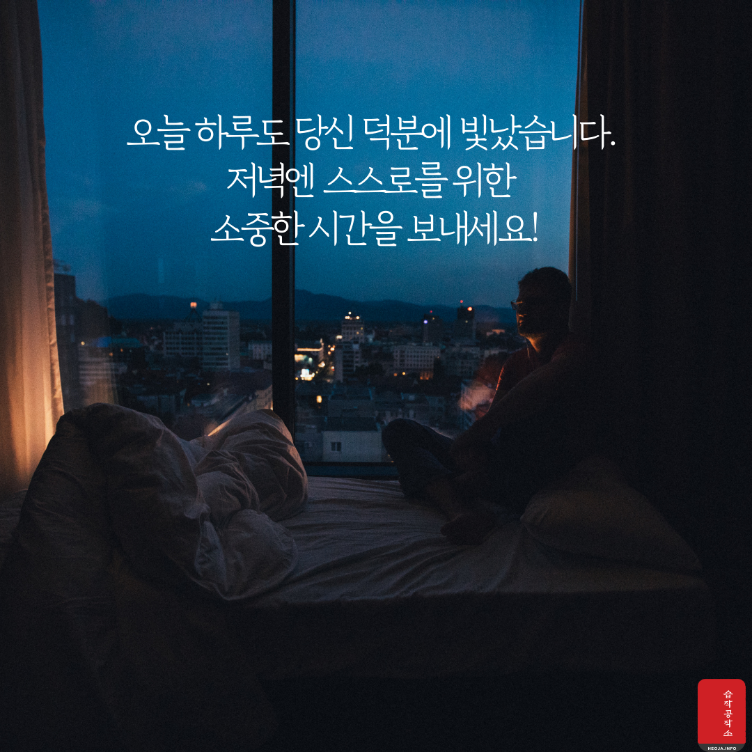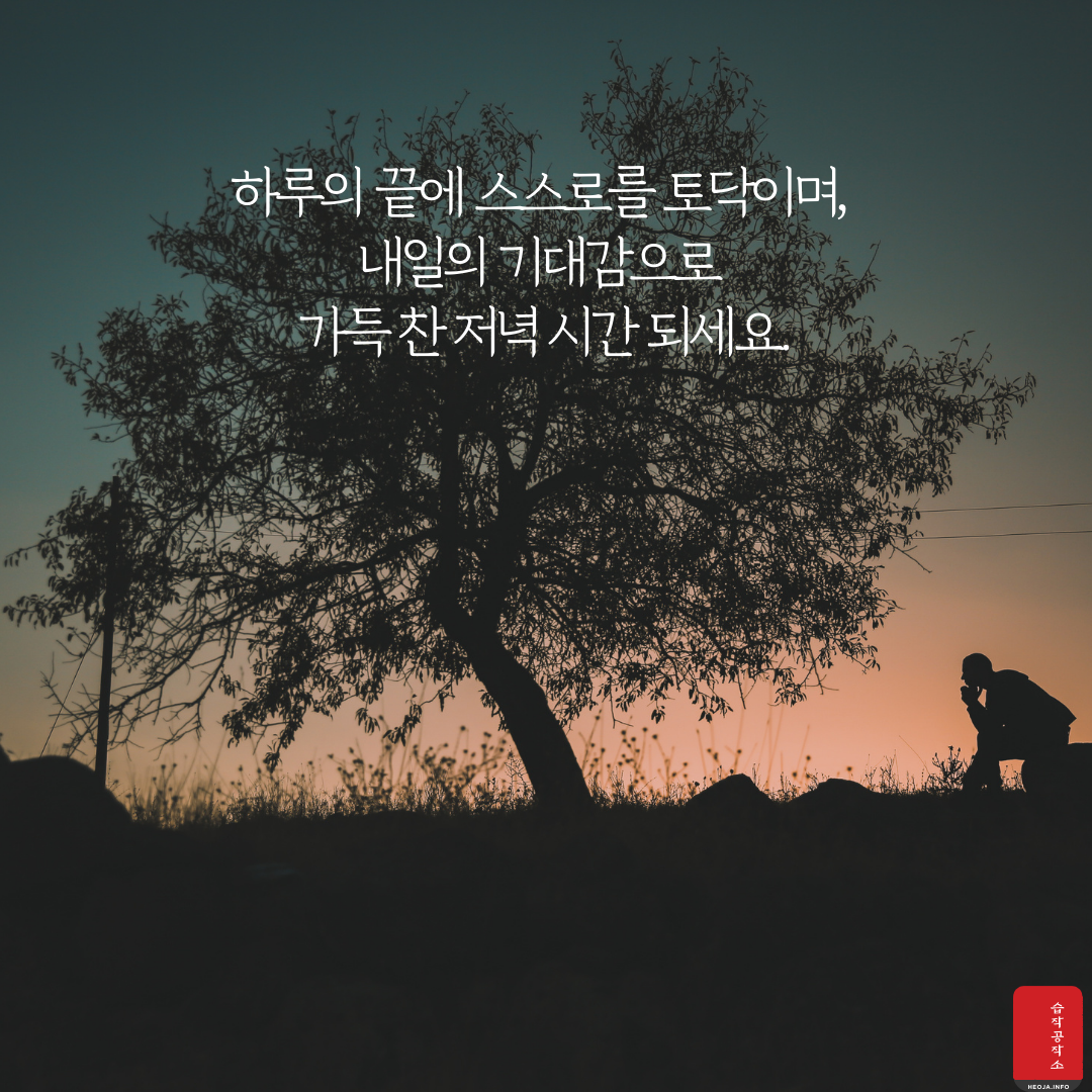 20. 하루의 끝에 스스로를 토닥이며, 내일의 기대감으로 가득 찬 저녁 시간 되세요.