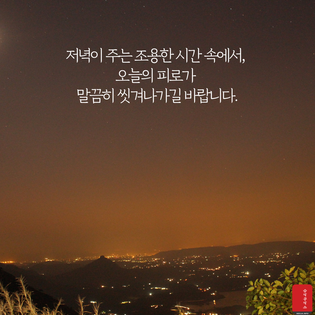 19. 저녁이 주는 조용한 시간 속에서, 오늘의 피로가 말끔히 씻겨나가길 바랍니다.