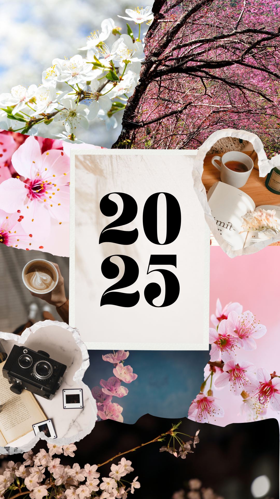 4. 비대칭 잡지 형식의 콜라주 벚꽃 배경화면 사진. 벚꽃만 다 채우려다가 커피와 카메라 이미지를 사용했다.