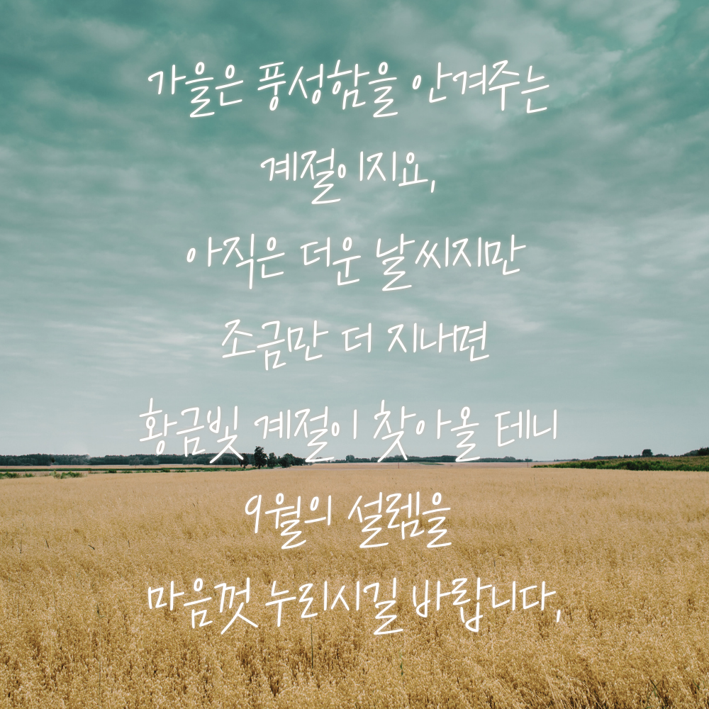 14. 선선한 바람이 불어오는 계절을 기다리며 맞이하는 9월, 새로운 다짐과 함께 시작해 보시는 건 어떨까요? 가을처럼 풍요롭고 따스한 달이 되시길 바랍니다.