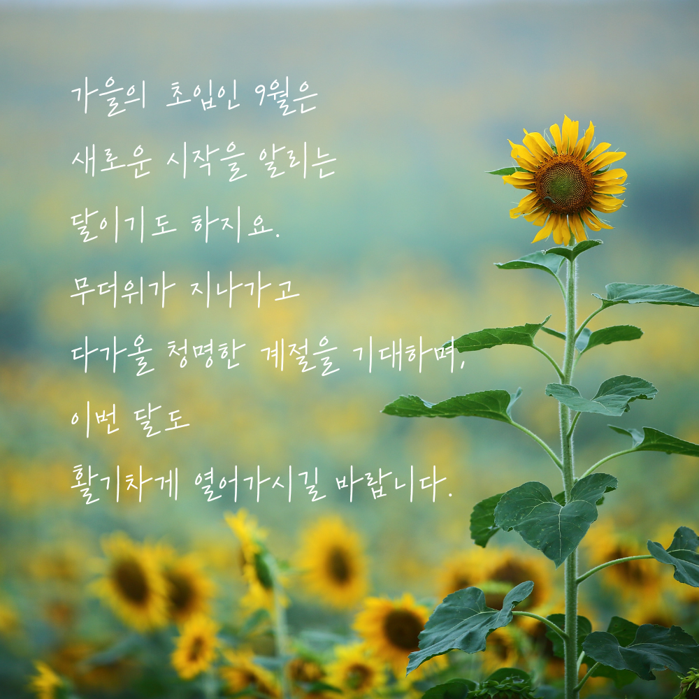 1. 9월의 문턱에 들어서니 뜨거운 여름 햇살이 조금은 누그러지고 가을 향기가 살며시 묻어나네요. 곧 선선한 바람이 불어올 날들을 기대하며 건강한 9월을 시작하시길 바랍니다.