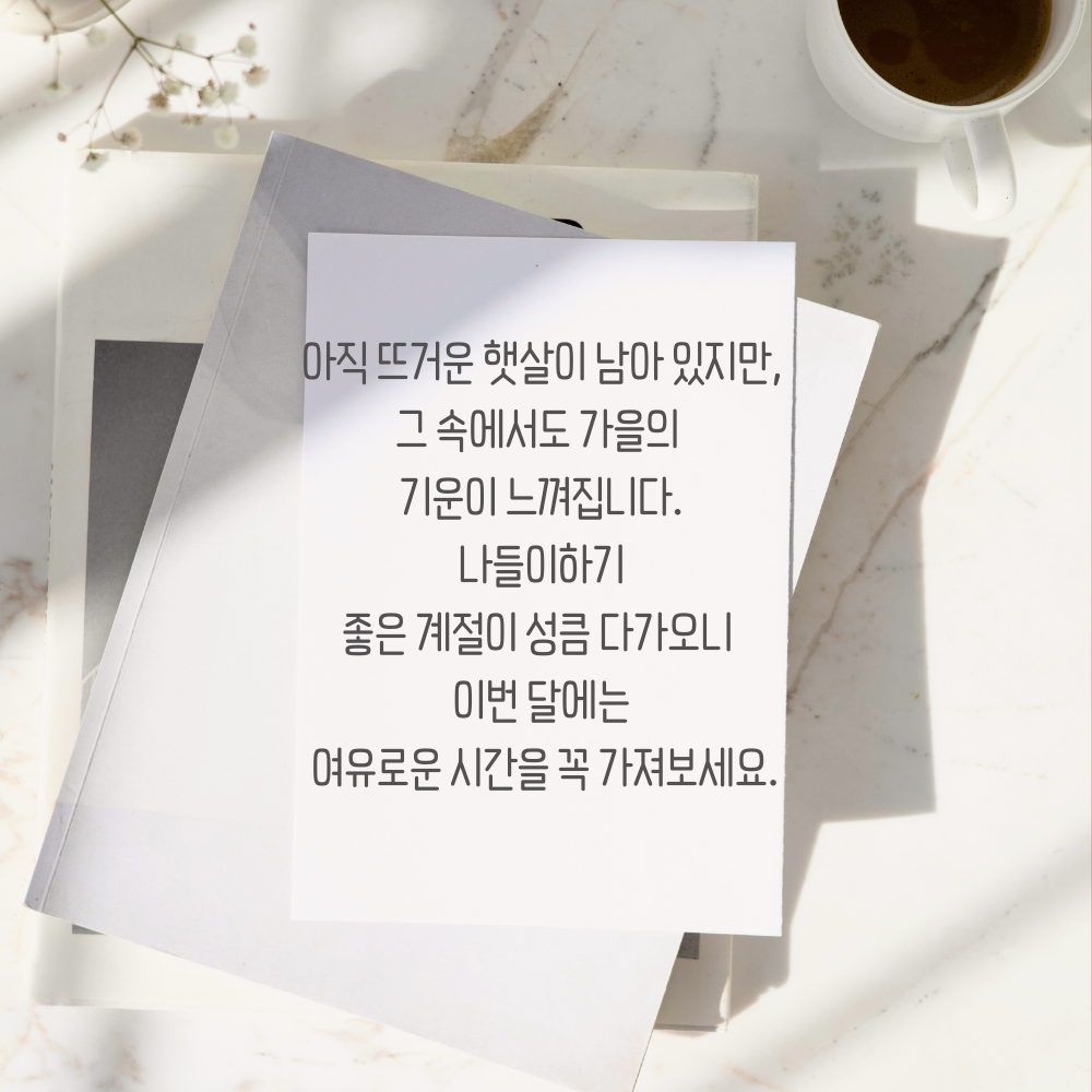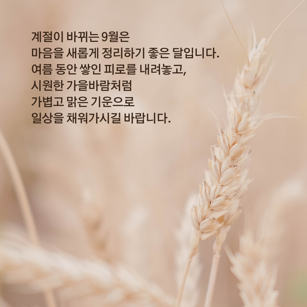 10. 계절이 바뀌는 9월은 마음을 새롭게 정리하기 좋은 달입니다. 여름 동안 쌓인 피로를 내려놓고, 시원한 가을바람처럼 가볍고 맑은 기운으로 일상을 채워가시길 바랍니다.