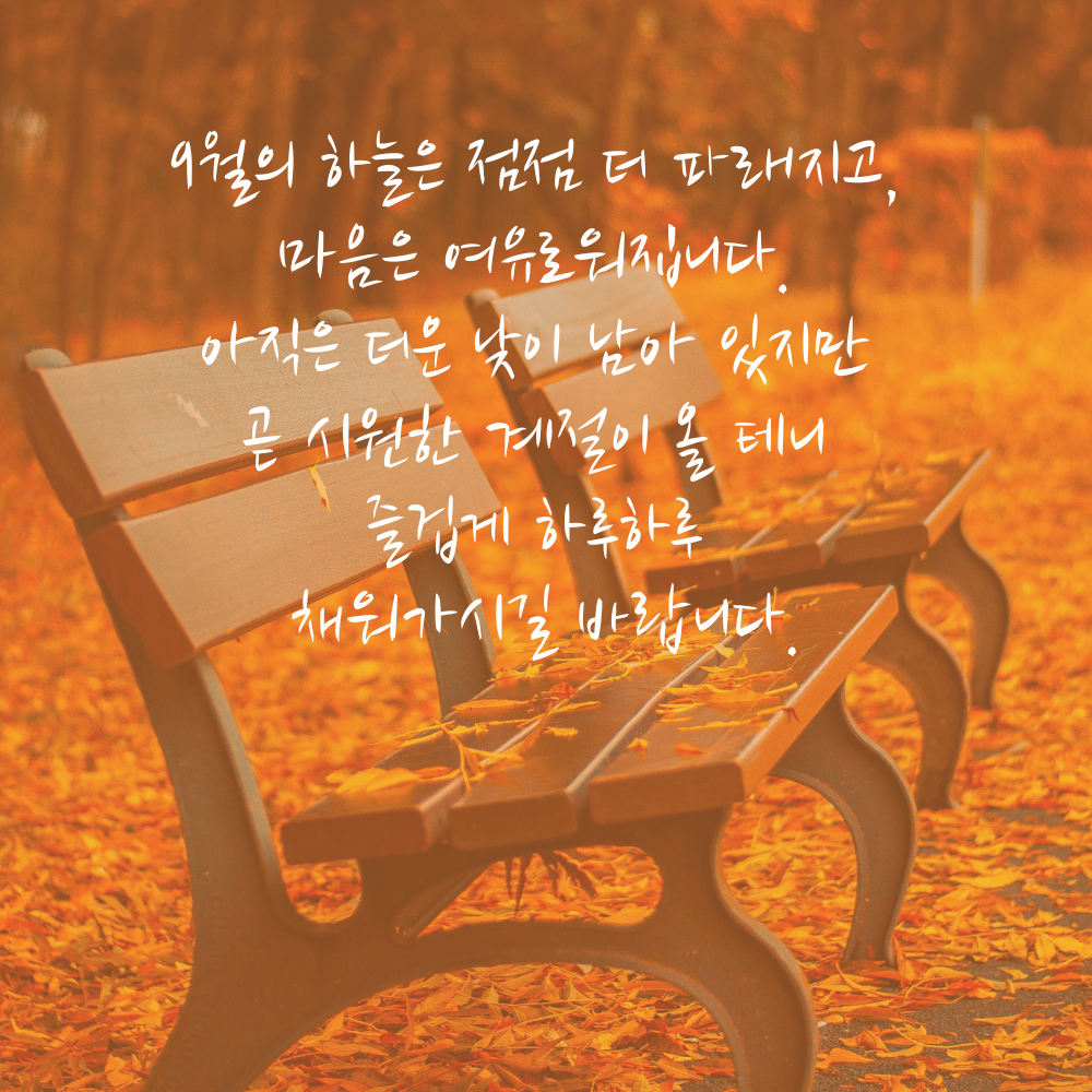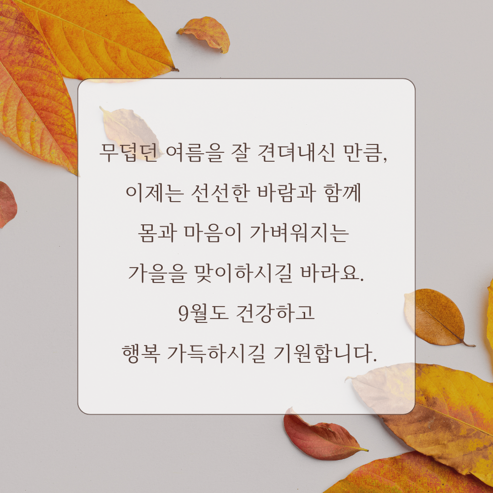4. 무덥던 여름을 잘 견뎌내신 만큼, 이제는 선선한 바람과 함께 몸과 마음이 가벼워지는 가을을 맞이하시길 바라요. 9월도 건강하고 행복 가득하시길 기원합니다.