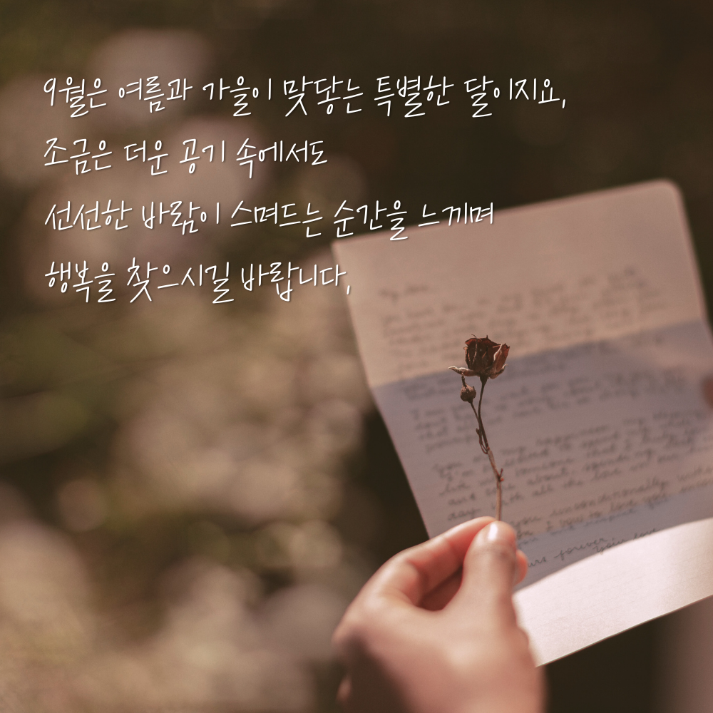7. 9월은 여름과 가을이 맞닿는 특별한 달이지요. 조금은 더운 공기 속에서도 선선한 바람이 스며드는 순간을 느끼며 행복을 찾으시길 바랍니다.