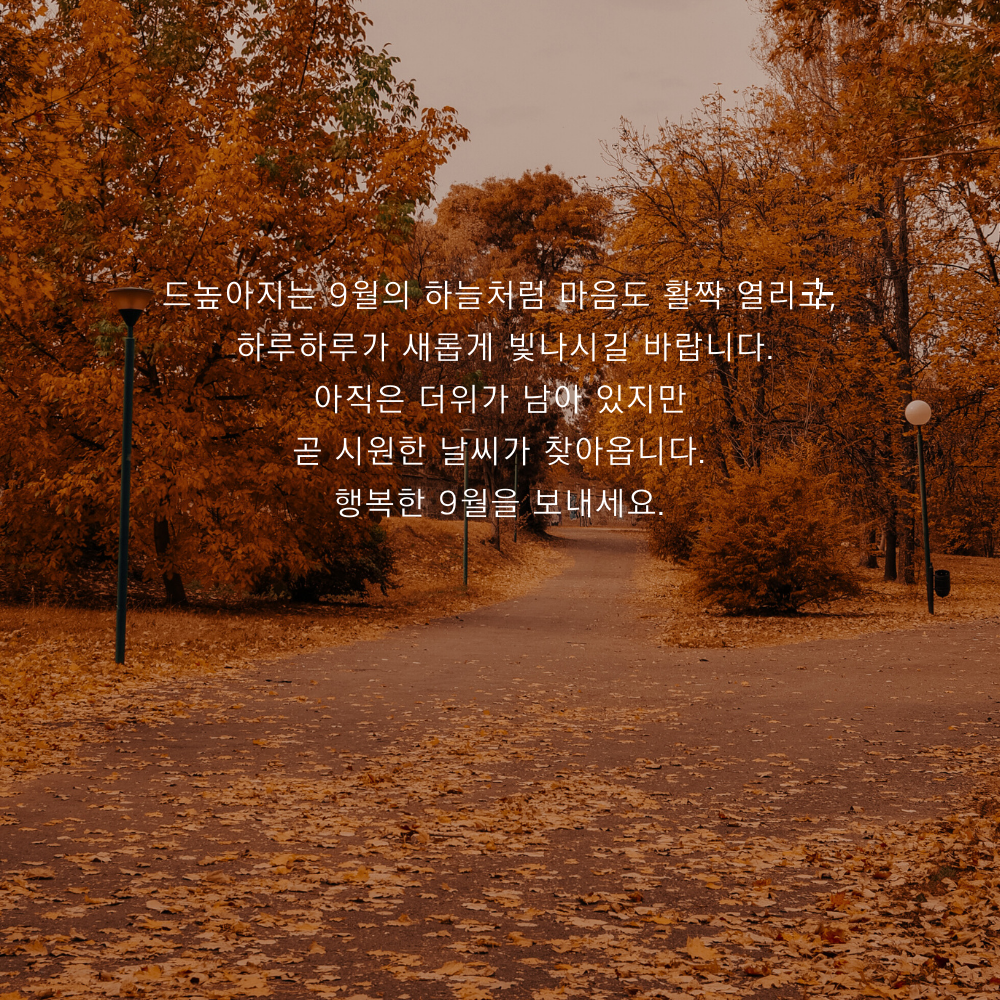 2025년 가을 9월 인사말 모음집과 이미지 문구 모음. 9월, 시간이 너무 빠르다. 9월 인사말로 선선한 가을 날씨를 기대해야 하는데 더워서...왜 이렇게 습한지. 그래도 기분 좋은 가을 9월 인사말 문구와 모음집을 공유하면서 안부 소식을 전해 보세요(?)