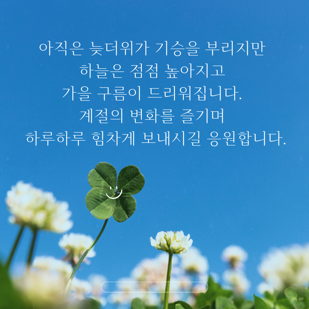 2. 아직은 늦더위가 기승을 부리지만 하늘은 점점 높아지고 가을 구름이 드리워집니다. 계절의 변화를 즐기며 하루하루 힘차게 보내시길 응원합니다.