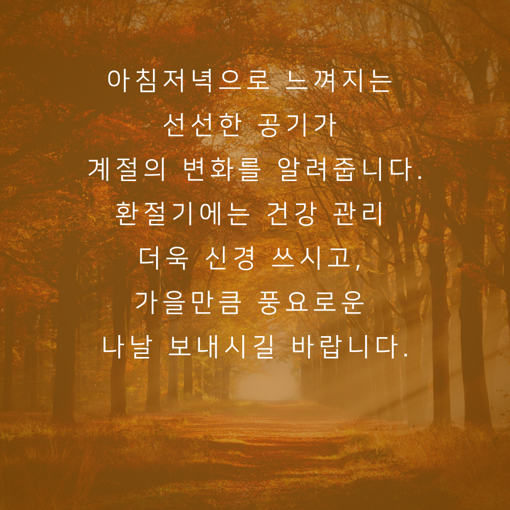 8. 아침저녁으로 느껴지는 선선한 공기가 계절의 변화를 알려줍니다. 환절기에는 건강 관리 더욱 신경 쓰시고, 가을만큼 풍요로운 나날 보내시길 바랍니다.