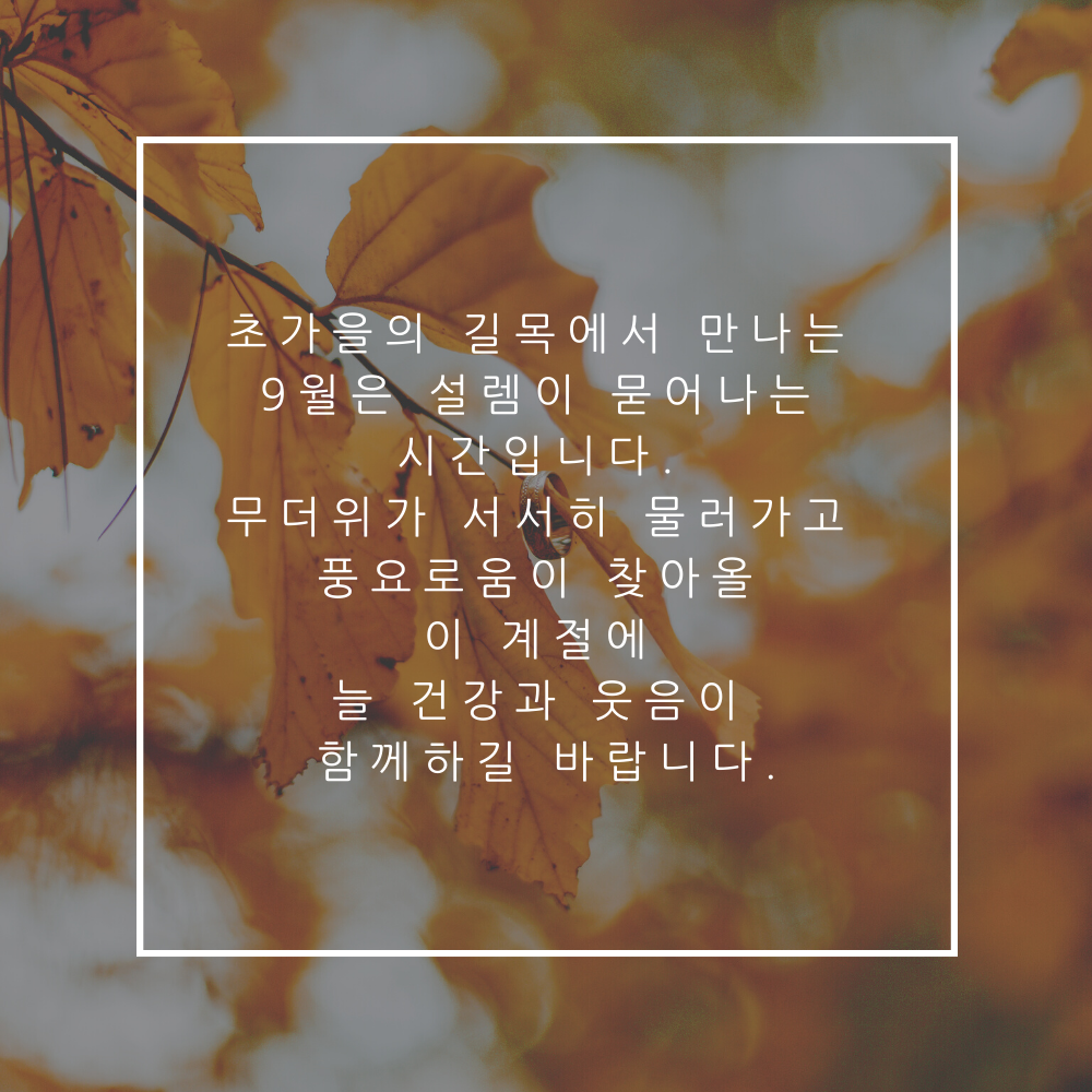 11. 초가을의 길목에서 만나는 9월은 설렘이 묻어나는 시간입니다. 무더위가 서서히 물러가고 풍요로움이 찾아올 이 계절에 늘 건강과 웃음이 함께하길 바랍니다.