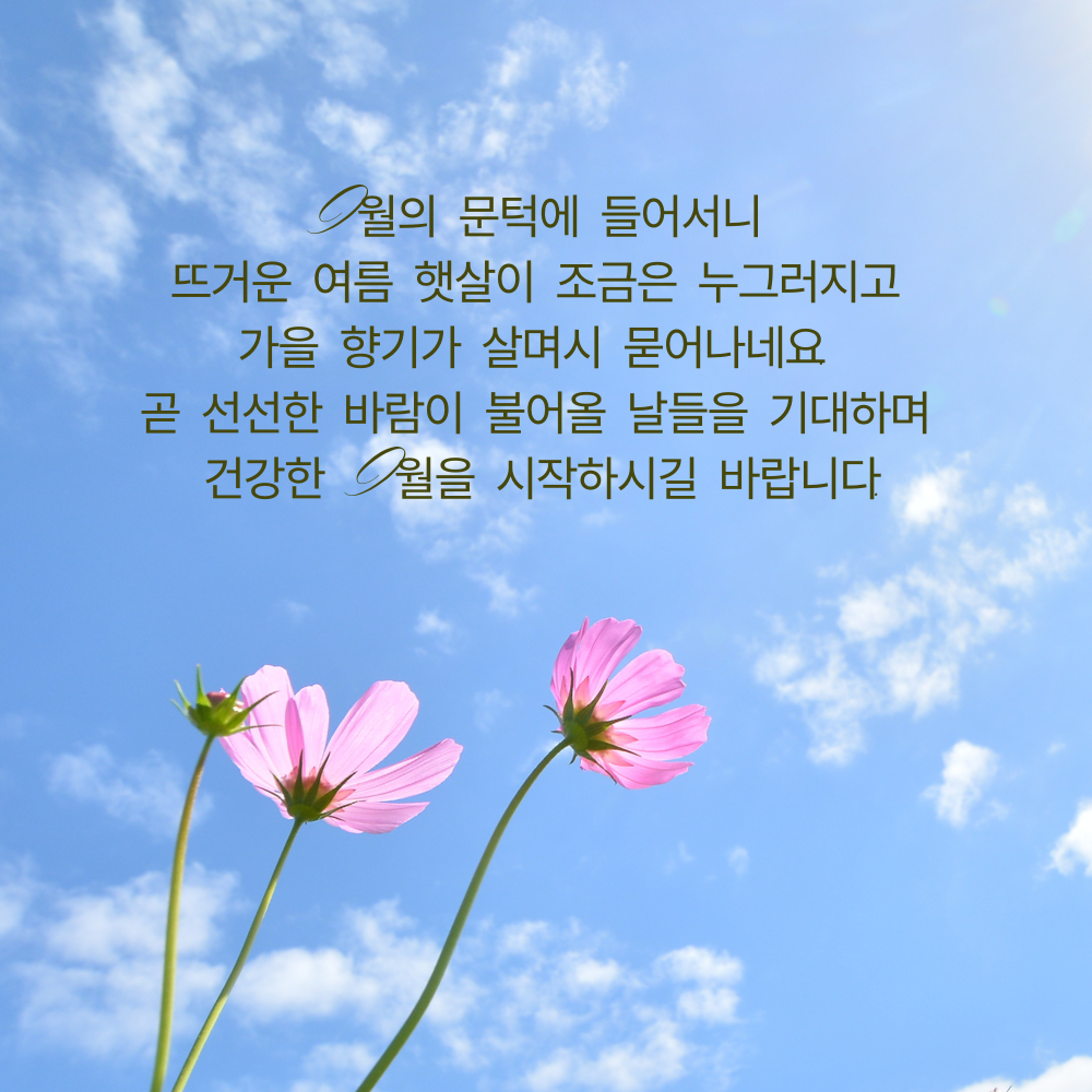 1. 9월의 문턱에 들어서니 뜨거운 여름 햇살이 조금은 누그러지고 가을 향기가 살며시 묻어나네요. 곧 선선한 바람이 불어올 날들을 기대하며 건강한 9월을 시작하시길 바랍니다.