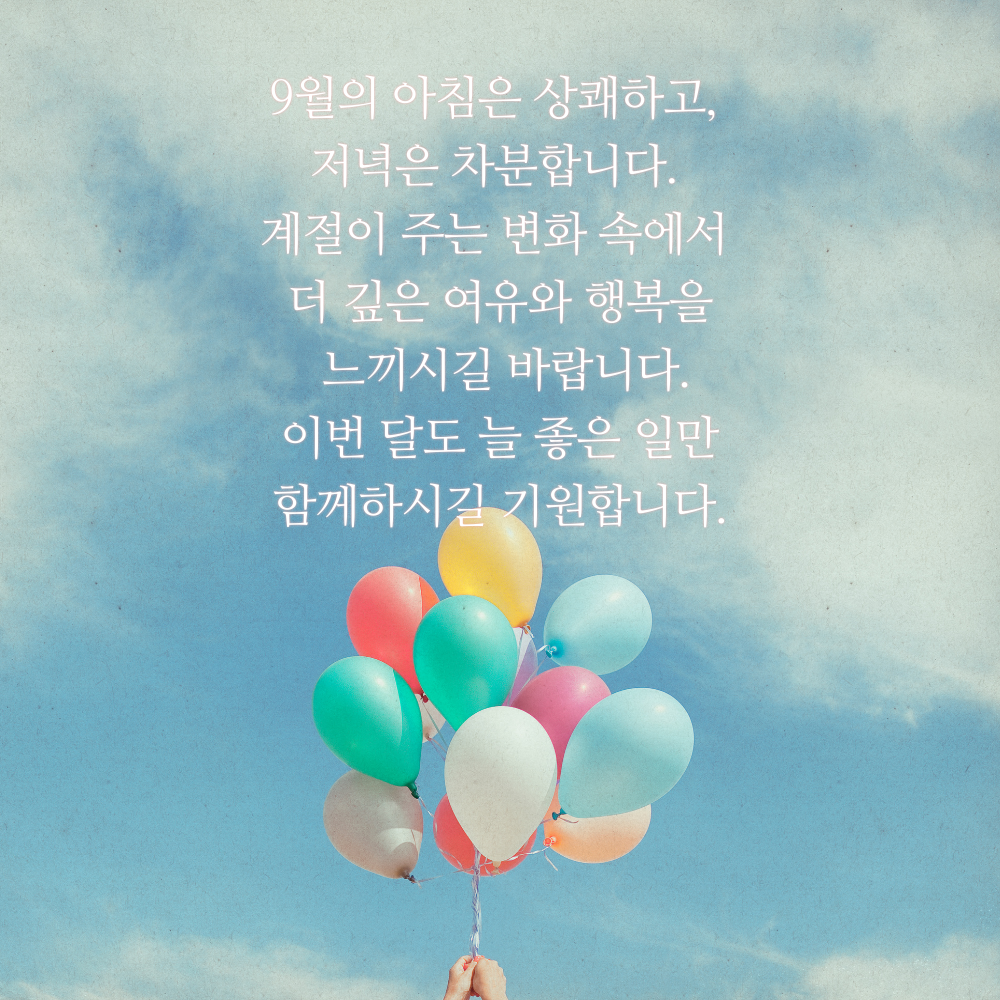 3. 가을의 초입인 9월은 새로운 시작을 알리는 달이기도 하지요. 무더위가 지나가고 다가올 청명한 계절을 기대하며, 이번 달도 활기차게 열어가시길 바랍니다.