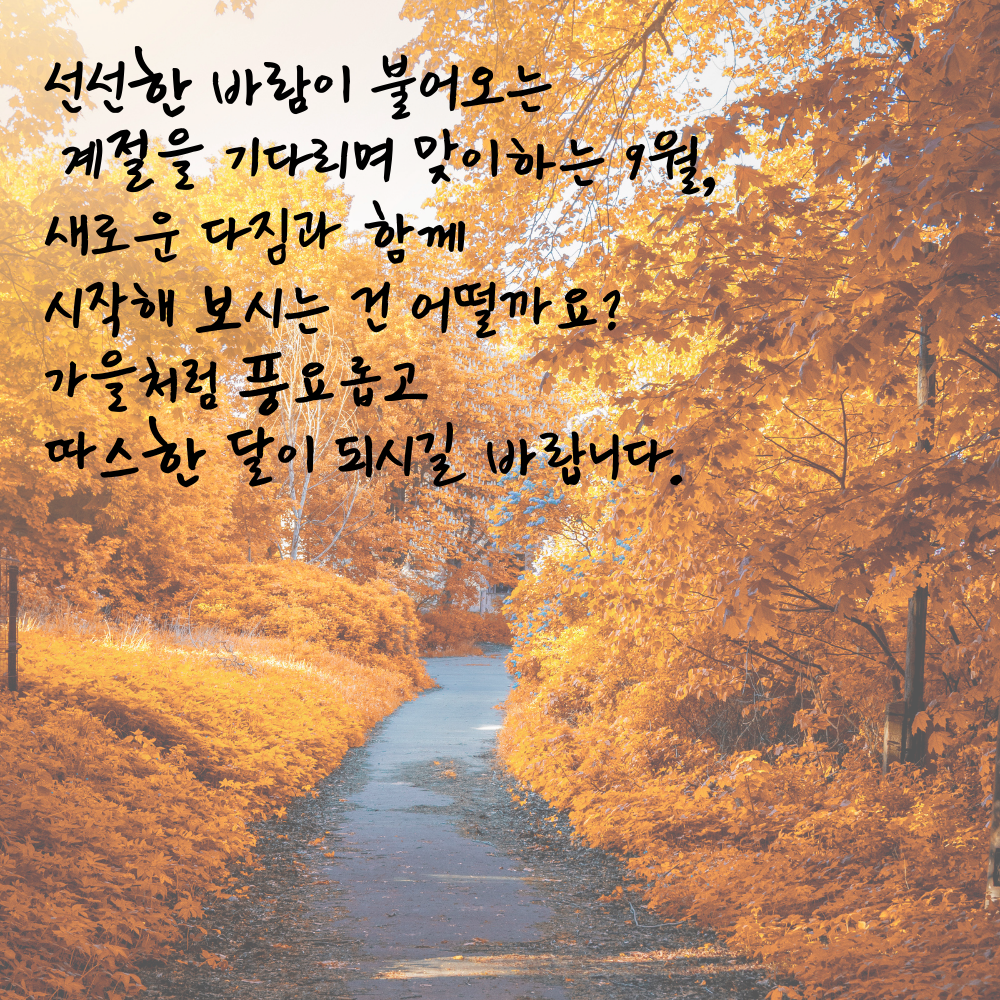 14. 선선한 바람이 불어오는 계절을 기다리며 맞이하는 9월, 새로운 다짐과 함께 시작해 보시는 건 어떨까요? 가을처럼 풍요롭고 따스한 달이 되시길 바랍니다.