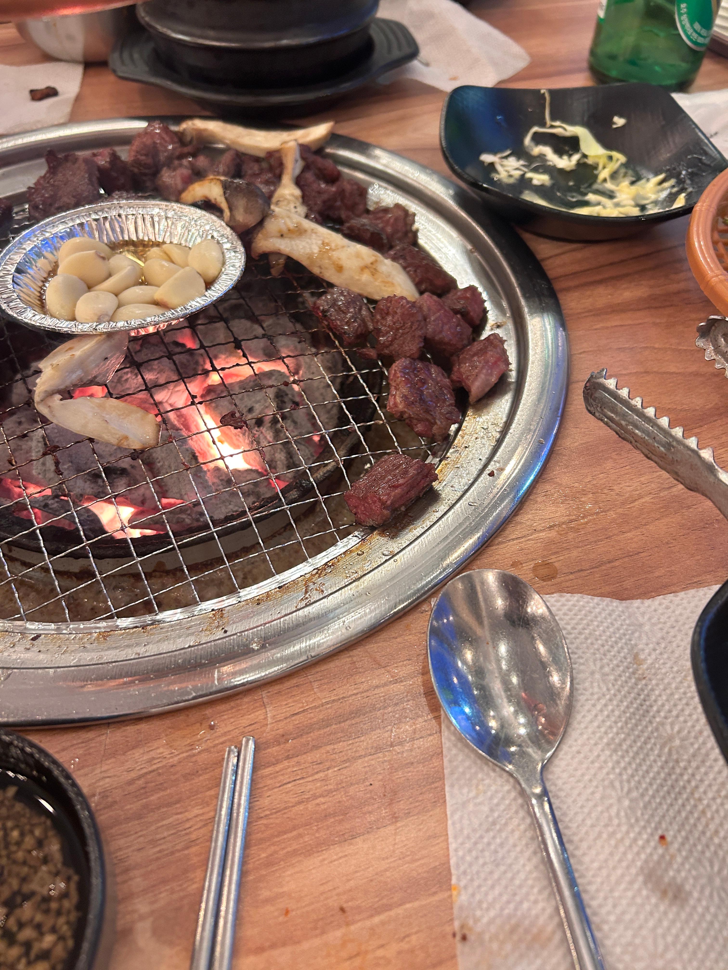 난 마늘을 좋아하는데 이렇게 은박지 위에 마늘 올려서 구울 수 있으니 더 좋더라 ㅋ 소고기 가격도 초반보다는 올랐지만 그래도 요새 삼겹살 1인 분에 15000원~18000원 수준이니 그나마 저렴하게 먹을 수 있다. 이야기했듯이 소주 맥주 가격도 그나마 저렴한 곳이니 술 먹기에도 솔직히 좋은 곳이라고 생가한다.